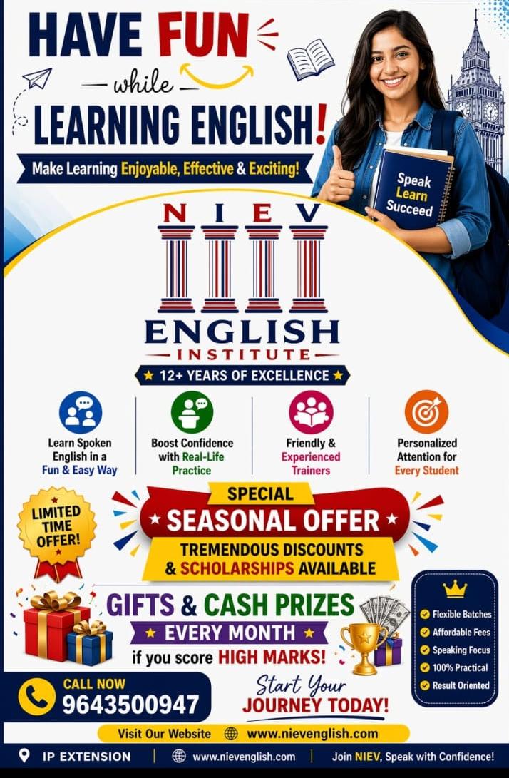 NIEV ENGLISH INSTITUTE is situated at I.P. Extn. East Delhi. It is the center of education where many students are getting education. NIEV has given education to approximately 5000 students many of them are doctors, engineers, advocates and so on. NIEV has designed career of school students and has helped them in scoring good percentage, helped job seekers to get their desired job and has also helped professionals to get promotions and hike in salary. In addition, life of so many housewives has changed after learning ENGLISH from NIEV.