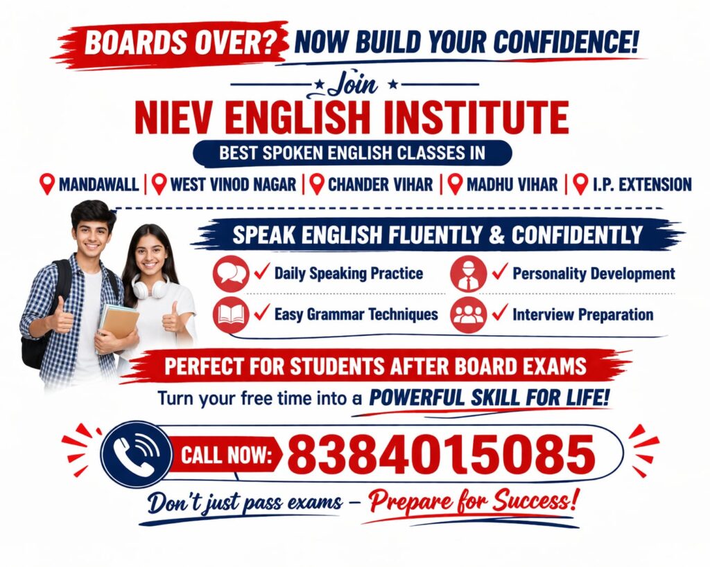 05 Apr Uncategorized Upgrade Your Future After Board Exams – Learn Spoken English with NIEV English Institute April 12, 2026 By admin 0 comments Locations Covered: Mandawali | West Vinod Nagar | Chander Vihar | Madhu Vihar | I.P. Extension Continue reading